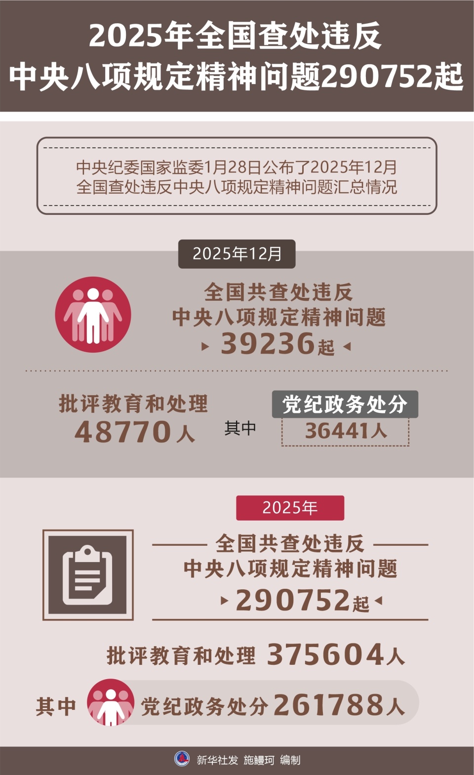 中央紀委國家監(jiān)委1月28日公布了2025年12月全國查處違反中央八項規(guī)定精神問題匯總情況。當月,全國共查處違反中央八項規(guī)定精神問題39236起,批評教育和處理48770人,其中黨紀政務處分36441人。2025年,全國共查處違反中央八項規(guī)定精神問題290752起,批評教育和處理375604人,其中黨紀政務處分261788人。