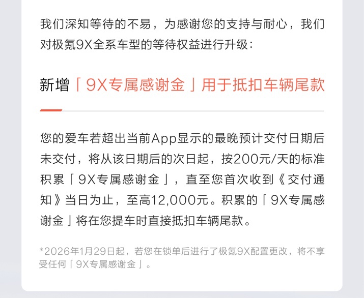 1月29日,記者獲悉,面對持續(xù)火爆的訂單和大量等車用戶,極氪9X推出行業(yè)最高標準的等車權益。官方公告顯示,若提車時間超過極氪App顯示的預計交付最晚日期,極氪將按200元/天發(fā)放用戶專屬感謝金,直至交付通知當日,累積金額最高12000元,并可在提車時直接抵扣尾款。