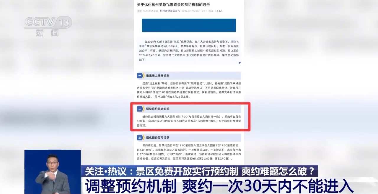 杭州西湖風景名勝區(qū)靈隱管理處 楊尚其:原有的爽約規(guī)則是從三次未履約開始,暫停一個月的預約資格,這也是參考一些景區(qū)的做法和案例。新規(guī)中我們新增累計的爽約限制,首次爽約預約賬號和被預約人就會被暫停預約資格30天,后續(xù)是疊加的,第二次就60天,第三次就90天。