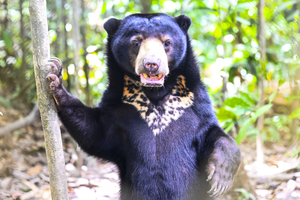 1月19日,在馬來(lái)西亞沙巴州東海岸城市山打根郊外的婆羅洲馬來(lái)熊保育中心,中心創(chuàng)始人兼首席執(zhí)行官黃修德給游客介紹馬來(lái)熊的習(xí)性。新華社記者 程一恒 攝