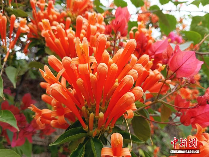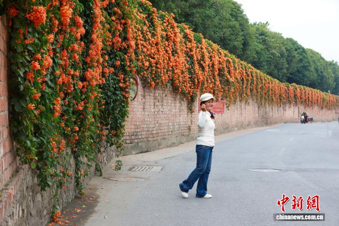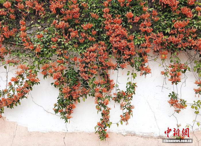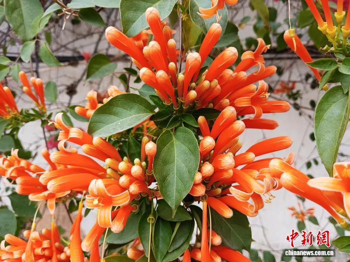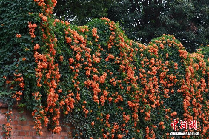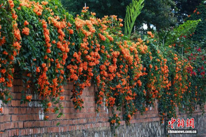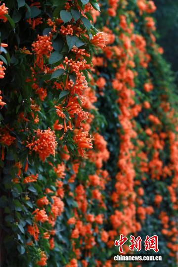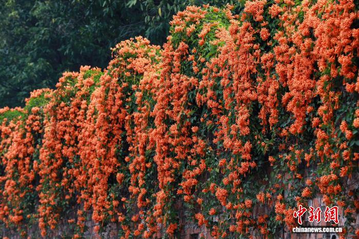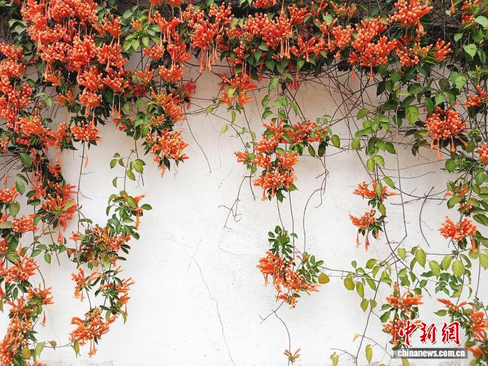 圖為炮仗花如瀑布般沿著圍墻和藤蔓傾瀉而下。黃云峰攝