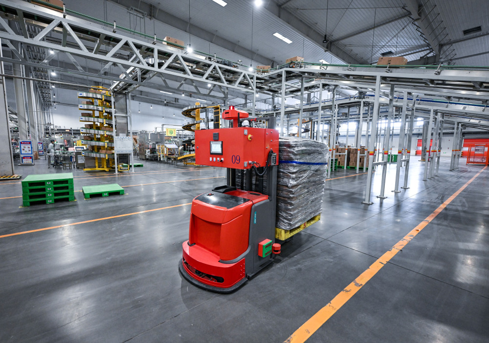 1月27日,一輛無(wú)人駕駛叉車(chē)在寧夏伊利包裝車(chē)間運(yùn)輸貨物。新華社記者 馮開(kāi)華 攝