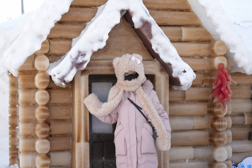 1月28日,參觀者在第二十七屆哈爾濱冰雪大世界園區(qū)中的植物彩色冰雕房屋前拍照。新華社記者 王松 攝