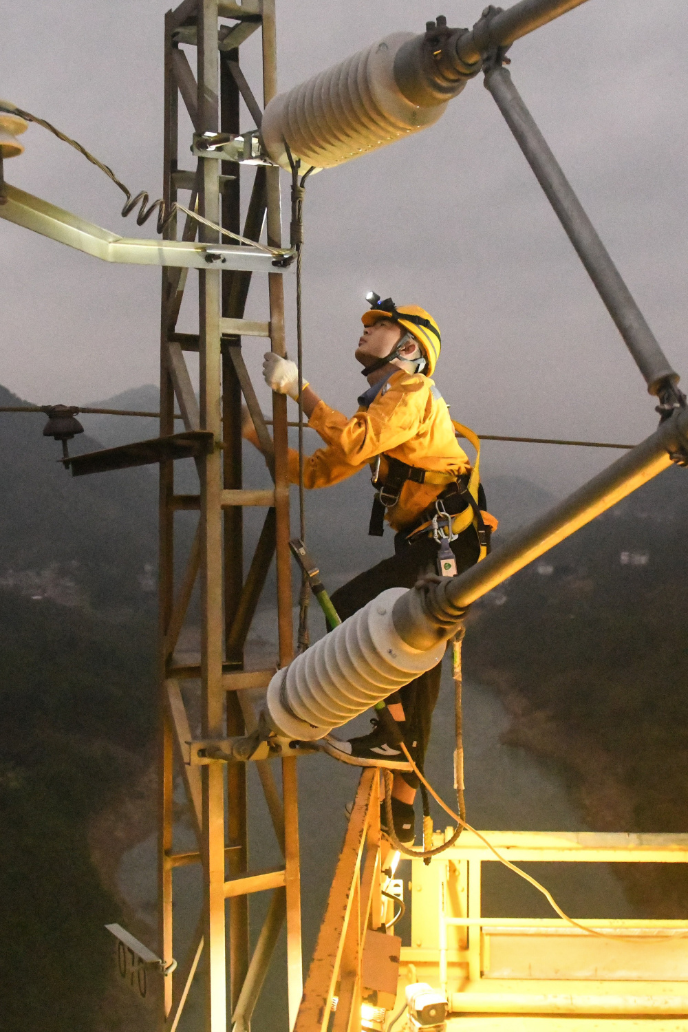 1月29日,中國鐵路南寧局集團有限公司接觸網工在支柱頂部測量錨段關節(jié)的數(shù)據(jù)參數(shù)。新華社記者 張愛林 攝