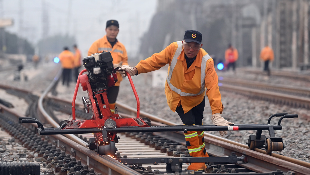 1月29日,中國鐵路南寧局集團有限公司百色工務段八渡線路車間工人在進行鋼軌打磨作業(yè)。新華社記者 張愛林 攝