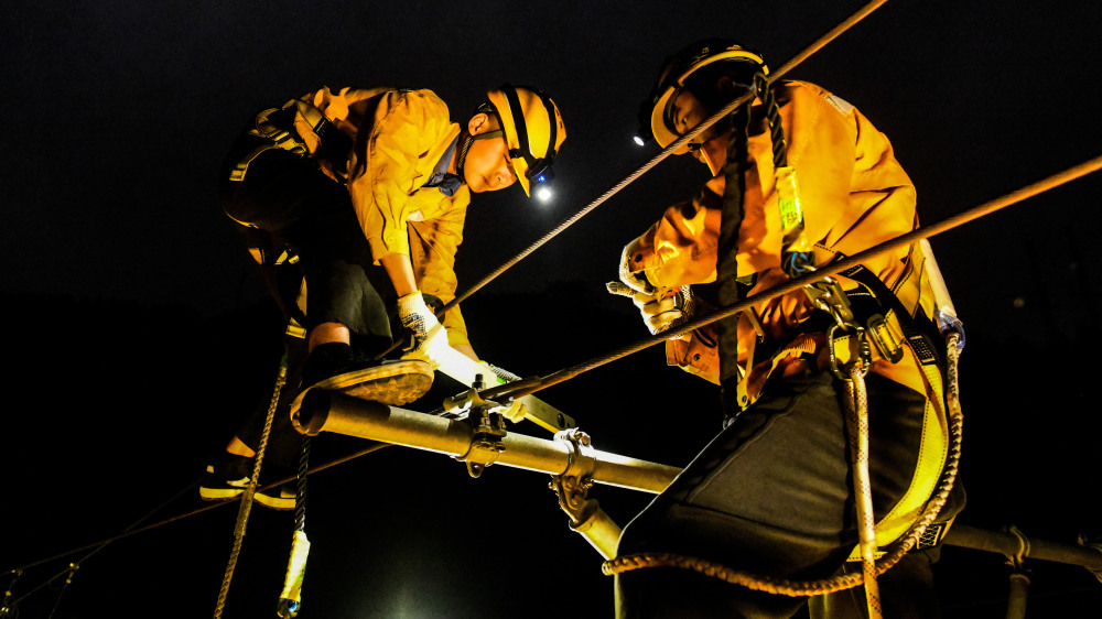 1月29日,中國鐵路南寧局集團有限公司南寧供電段的接觸網工在對南盤江鐵路大橋上的接觸網設備進行維修作業(yè)。新華社記者 張愛林 攝