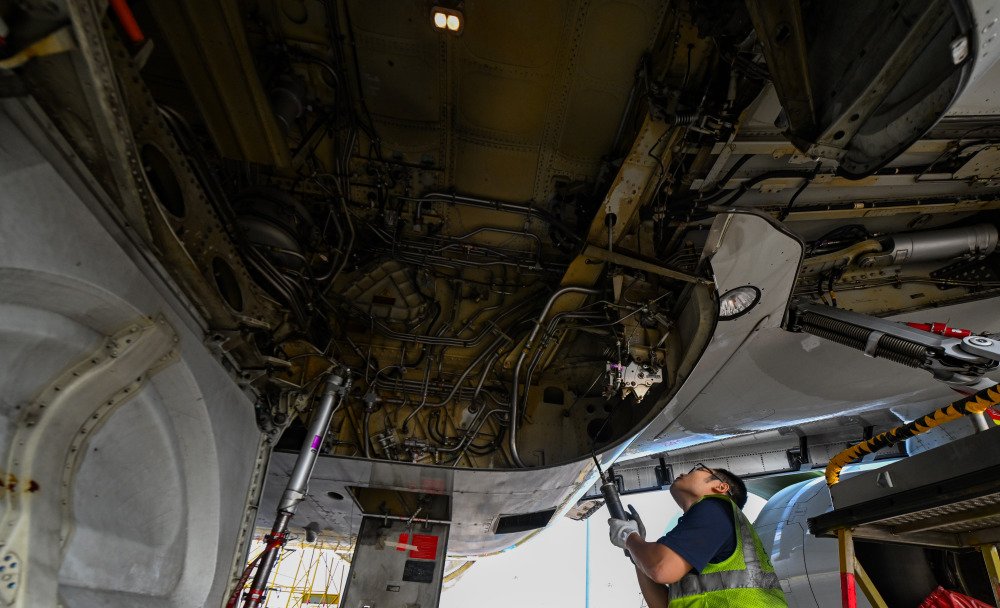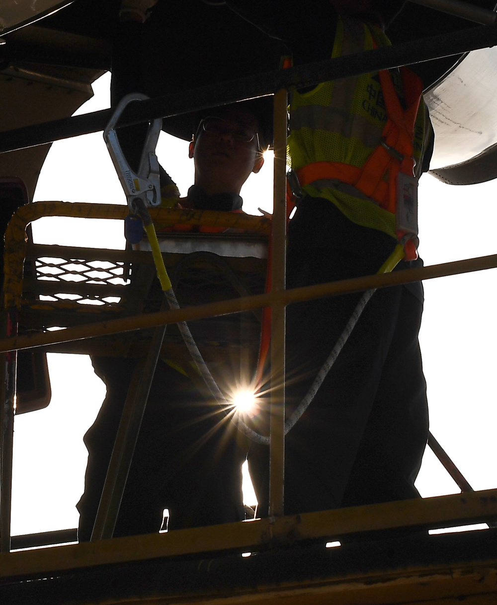 1月29日,海口美蘭國際機場停機坪上,南航工程技術分公司機務工程師在對飛機進行深度檢查。新華社記者 楊冠宇 攝