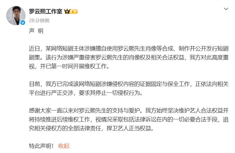 近日,某網(wǎng)絡(luò)短劇主體涉嫌擅自使用羅云熙先生肖像等合成、制作并公開發(fā)行短劇劇集。該行為涉嫌嚴重侵害羅云熙先生的肖像權(quán)及相關(guān)合法權(quán)益,我方對此高度重視,并已第一時間開展維權(quán)工作。