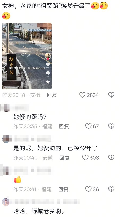 還有安徽網(wǎng)友在評(píng)論區(qū)曬出“祖賢路”照片,向她致謝。