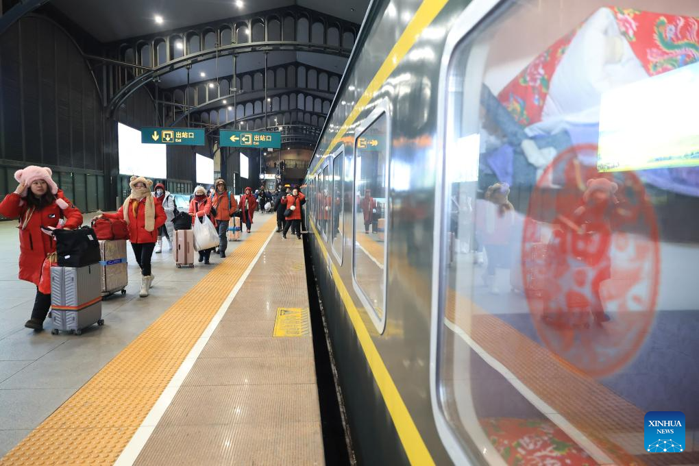 Foreign tourists board K7041, a train themed on folk culture of northeast China, at Harbin Railway Station in Harbin, northeast China's Heilongjiang Province, Jan. 19, 2026. Recently, tourists from Southeast Asian countries have been flocking to Harbin, hailed as China's "Ice City," with unprecedented enthusiasm. (Photo by Xu Shuai/Xinhua)