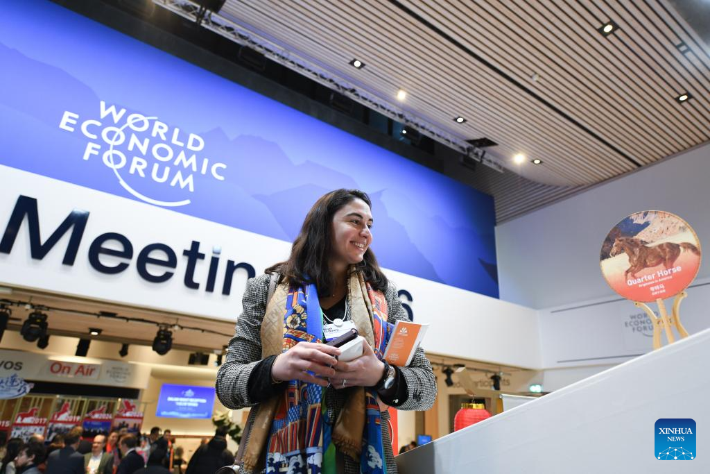 A participant looks at a decoration themed on the Chinese lunar Year of the Horse during the "Dalian Night" reception at the World Economic Forum (WEF) Annual Meeting 2026 in Davos, Switzerland, Jan. 20, 2026. Northeast China's coastal city of Dalian held a reception here on Tuesday evening, featuring music performances and local gourmet cuisine. Dalian will host the WEF's Annual Meeting of the New Champions 2026, also known as the Summer Davos, in June. (Xinhua/Lian Yi)