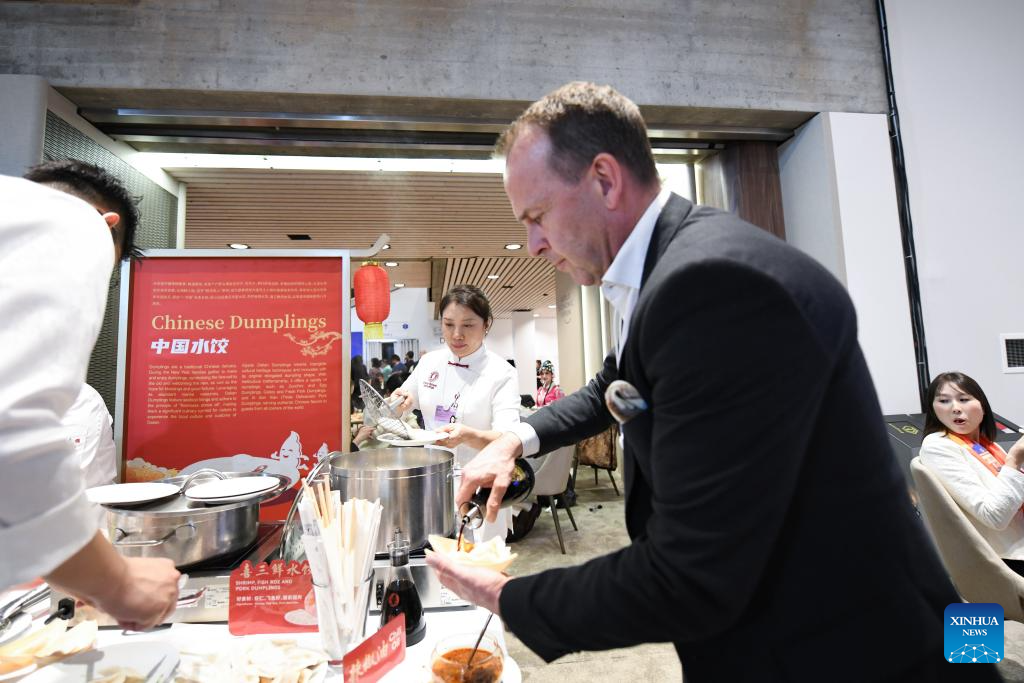 A participant tastes Chinese dumplings during the "Dalian Night" reception at the World Economic Forum (WEF) Annual Meeting 2026 in Davos, Switzerland, Jan. 20, 2026. Northeast China's coastal city of Dalian held a reception here on Tuesday evening, featuring music performances and local gourmet cuisine. Dalian will host the WEF's Annual Meeting of the New Champions 2026, also known as the Summer Davos, in June. (Xinhua/Lian Yi)