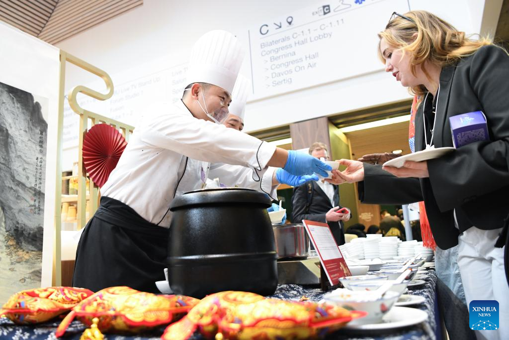 Participants taste Chinese cuisine during the "Dalian Night" reception at the World Economic Forum (WEF) Annual Meeting 2026 in Davos, Switzerland, Jan. 20, 2026. Northeast China's coastal city of Dalian held a reception here on Tuesday evening, featuring music performances and local gourmet cuisine. Dalian will host the WEF's Annual Meeting of the New Champions 2026, also known as the Summer Davos, in June. (Xinhua/Lian Yi)