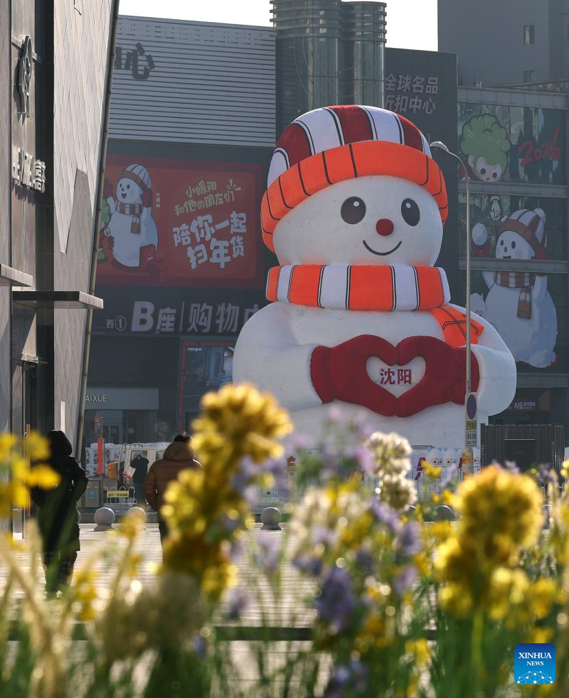 A giant snowman is seen in front of a shopping mall in Shenyang, northeast China's Liaoning Province, Jan. 22, 2026. (Xinhua/Li Gang)