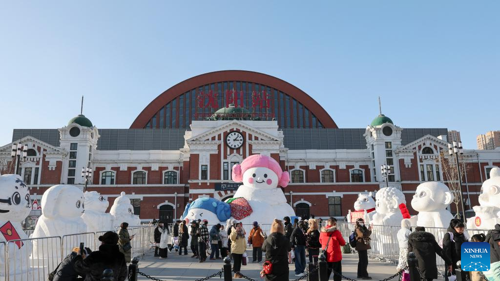 Giant snowmen are seen at the Shenyang Railway Station in Shenyang, northeast China's Liaoning Province, Jan. 22, 2026. (Xinhua/Li Gang)